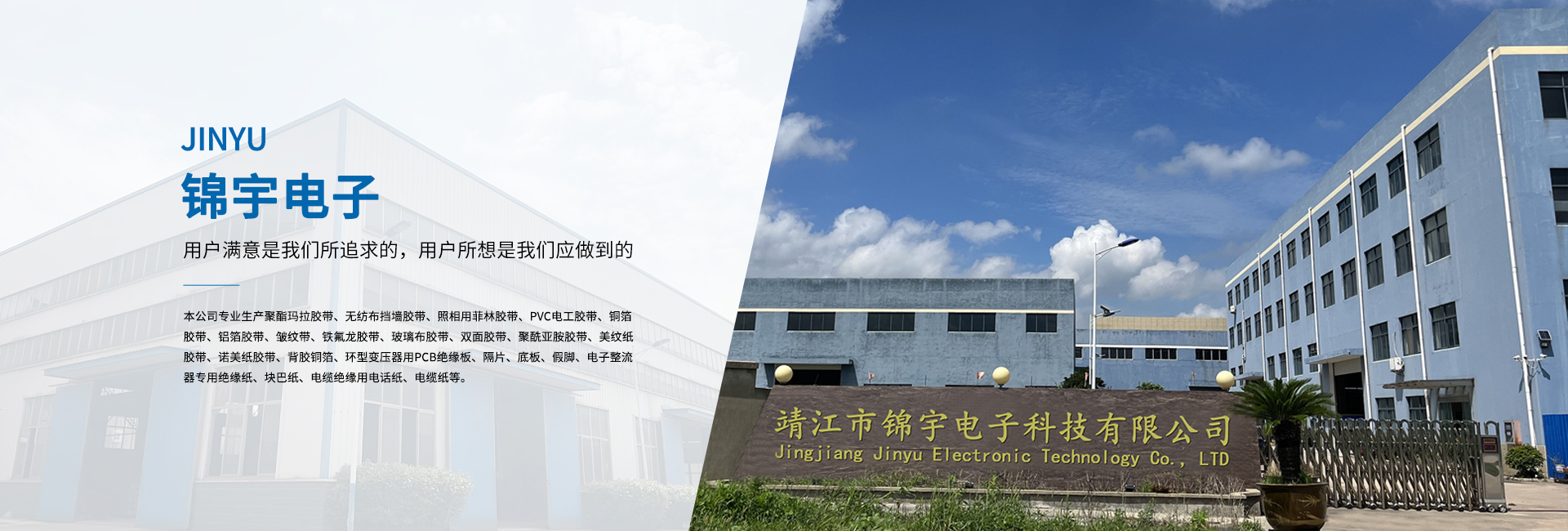 靖江市錦宇電子科技有限公司地處—靖江市。與上海、南京隔江相望,滬寧高速和京滬高速將蘇錫常及京廣連為一體,東依開放港口城市南通,西連新長鐵路,南臨長江萬噸船用碼頭,北接寧通一級高速公路,水陸交通便捷,經營環境優良。 本公司專業生產聚酯瑪拉膠帶、無紡布擋墻膠帶、照相用菲林膠帶、PVC電工膠帶、銅箔膠帶、鋁箔膠帶、皺紋帶、鐵氟龍膠帶、玻璃布膠帶、雙面膠帶、聚酰亞胺膠帶、美紋紙膠帶、諾美紙膠帶、背膠銅箔、環型變壓器用PCB絕緣板、隔片、底板、假腳、電子整流器專用絕緣紙、塊巴紙、電纜絕緣用電話紙、電纜紙等。 公司依靠先進的科學管理,精良的生產裝備,合理的工藝設計,完善的檢測設備,以著“科技創新、質量為本、誠信服務”的信念。并嚴格貫徹ISO9001國際質量體系的程序和規格,為廣大用戶提供優質的產品與滿意的服務。 多年來,公司本著“用戶滿意是我們所追求的,用戶所想是我們應做到的”的經營理念;“質量保障,價格合理,服務誠信”的企業宗旨。熱忱歡迎海內外各界人士、朋友前來洽談、合作,攜手共創輝煌的明天。
